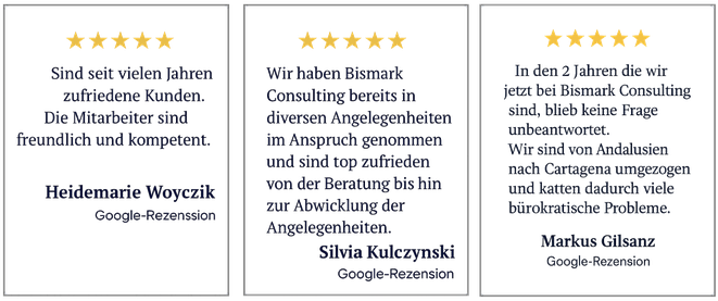 Bei Bismark Consulting ist es unser Ziel, deutschsprachigen Residenten sowie Nicht-Residenten in Spanien eine umfassende Betreuung zu bieten. Ob Sie sich dauerhaft in Spanien niederlassen oder nur zeitweise im Land leben – wir sorgen mit unserer professionellen Steuerberatung, Rechtsberatung und Expertise im Immobilienrecht dafür, dass Sie Ihren Alltag in Spanien sorgenfrei genießen können.